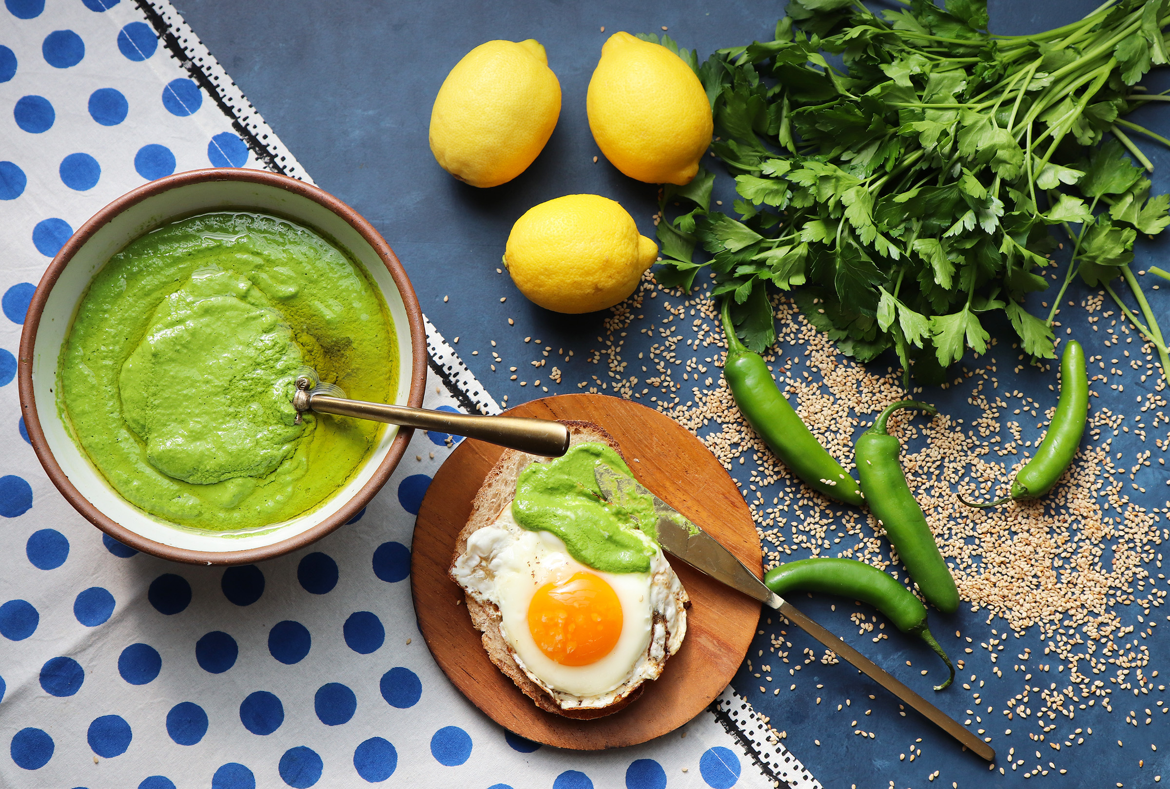 For the past three decades, some sort of green condiment has made a permanent home in my refrigerator. A sauce that served many functions – adds a fresh brightness to toast, avocado and eggs first thing in the morning to dipping crackers and cheese in the afternoon. It makes a great sandwich spread and a marinade for a piece of fish. There is usually a dollop of it on meals I eat at home. I started out with a rendition of cilantro chutney by adding apples and yogurt, then moved on to a salsa verde sort of condiment heavy on the garlic and olive oil and then for a while, I was making Kriti Kitchen’s fabulous parsley pine nut sauce on repeat at home. What has finally emerged is this latest version, which I consider the best so far, is using sesame seeds and ginger which is a combination of all the above ~ the trick it to not put too much lemon juice or the color and flavor with dullen within a day or two. Feel free to replace the ginger with 5 to 6 cloves of raw garlic or use a little of both. Once you make this sauce and get hooked on to it, I promise you will want a little bit every day!