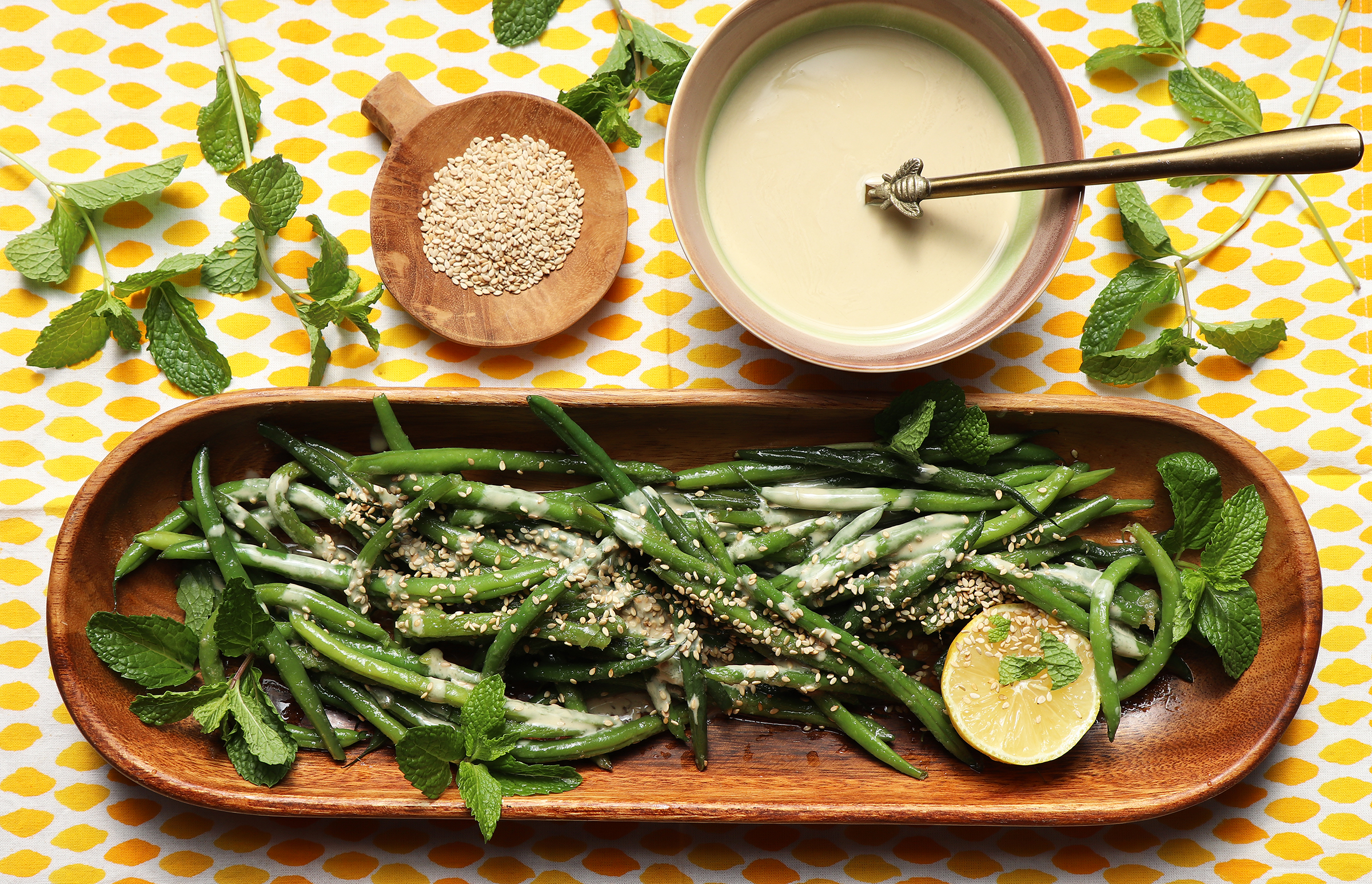 Green beans are one vegetable that need a little bit of help with flavor. In this recipe, the sweetness of the coconut oil, the tanginess of the ginger, the heat of the serrano pepper and the creaminess of the tahini give the beans a big boost of flavor. Try to cook the beans until they are soft but still bright green in color however if they cook longer, they will still taste good. Given that sesame seeds are one of the best sources of calcium, I am always looking for a reason to use tahini. Try this quick recipe for your Thanksgiving table – you can make it ahead of time, just drizzle the tahini last minute.